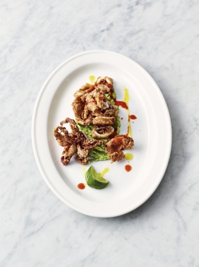 Sprø blæksprutte og most avokado