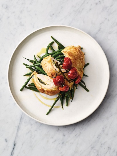 Innbakt pesto kylling med tomater og grønne bønner