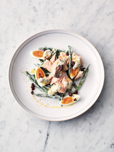 Dampet laks med egg og grønne bønner